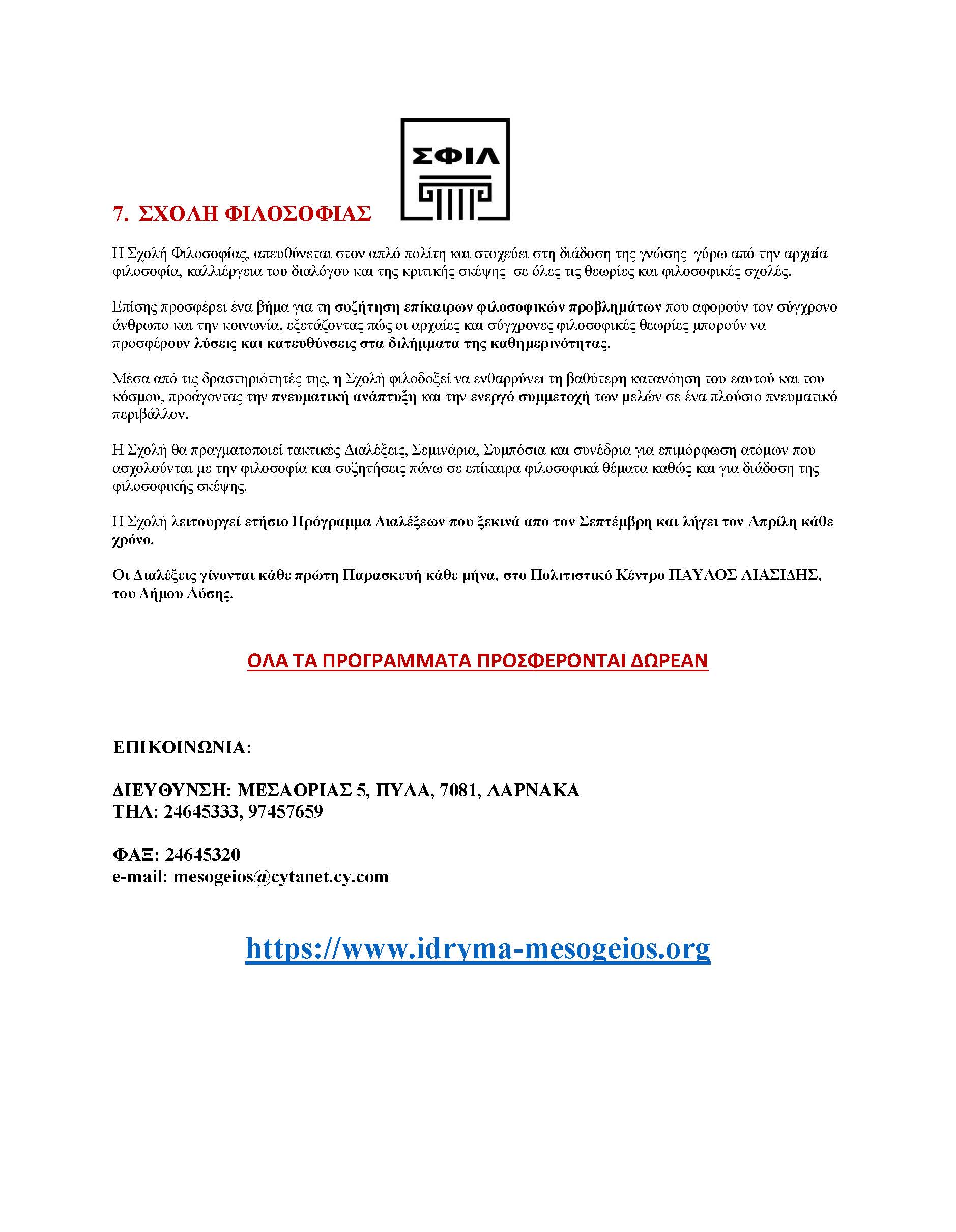 3. Ίδρυση και λειτουργία σε συνεργασία με την Φιλοσοφική Εταιρεία Κύπρου ΣΧΟΛΗ ΦΙΛΟΣΟΦΙΑΣ.