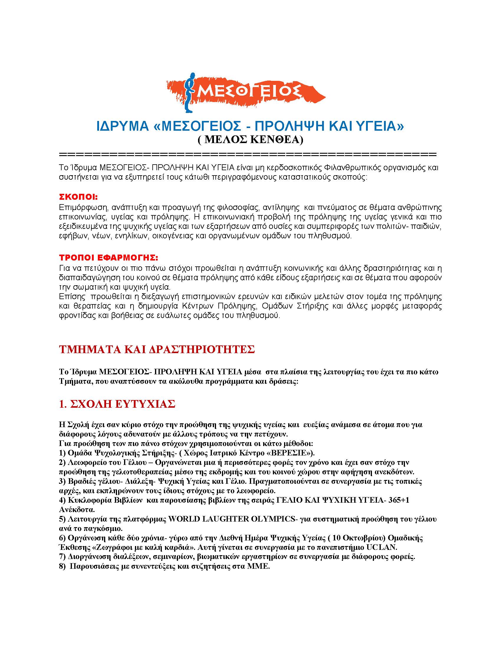 To ίδρυμα «ΜΕΣΟΓΕΙΟΣ- ΠΡΟΛΗΨΗ ΚΑΙ ΥΓΕΙΑ» μέσα στα πλαίσια της λειτουργίας του έχει τα πιο κάτω Τμήματα, που αναπτύσσουν τα πιο κάτω προγράμματα και δράσεις:
