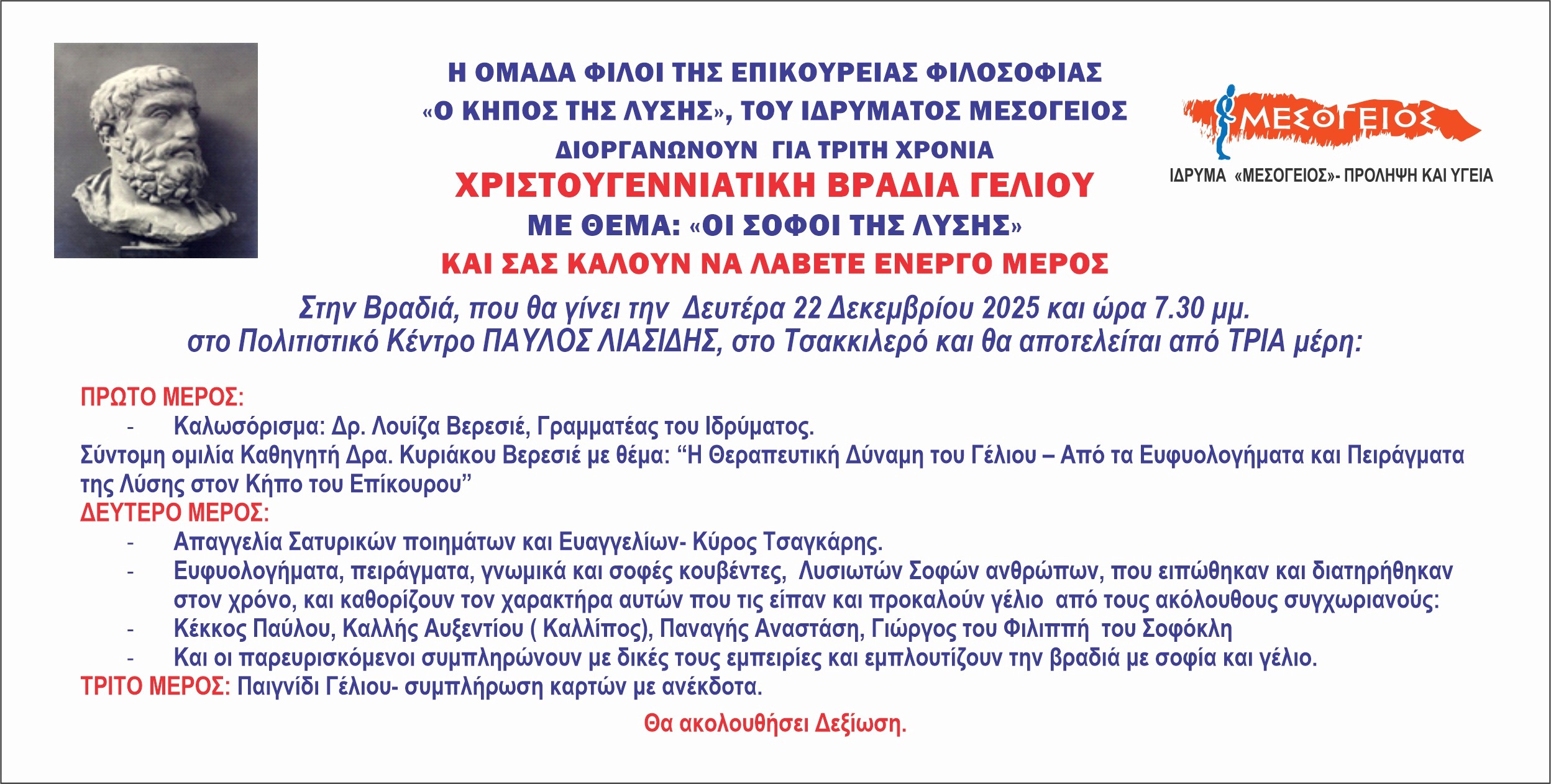 Η ομάδα της Επικούρειας Φιλοσοφίας «Ο ΚΗΠΟΣ ΤΗΣ ΛΥΣΗΣ» του ιδρύματος ΜΕΣΟΓΕΙΟΣ - Πρόληψη και Υγεία, ανακοινώνει